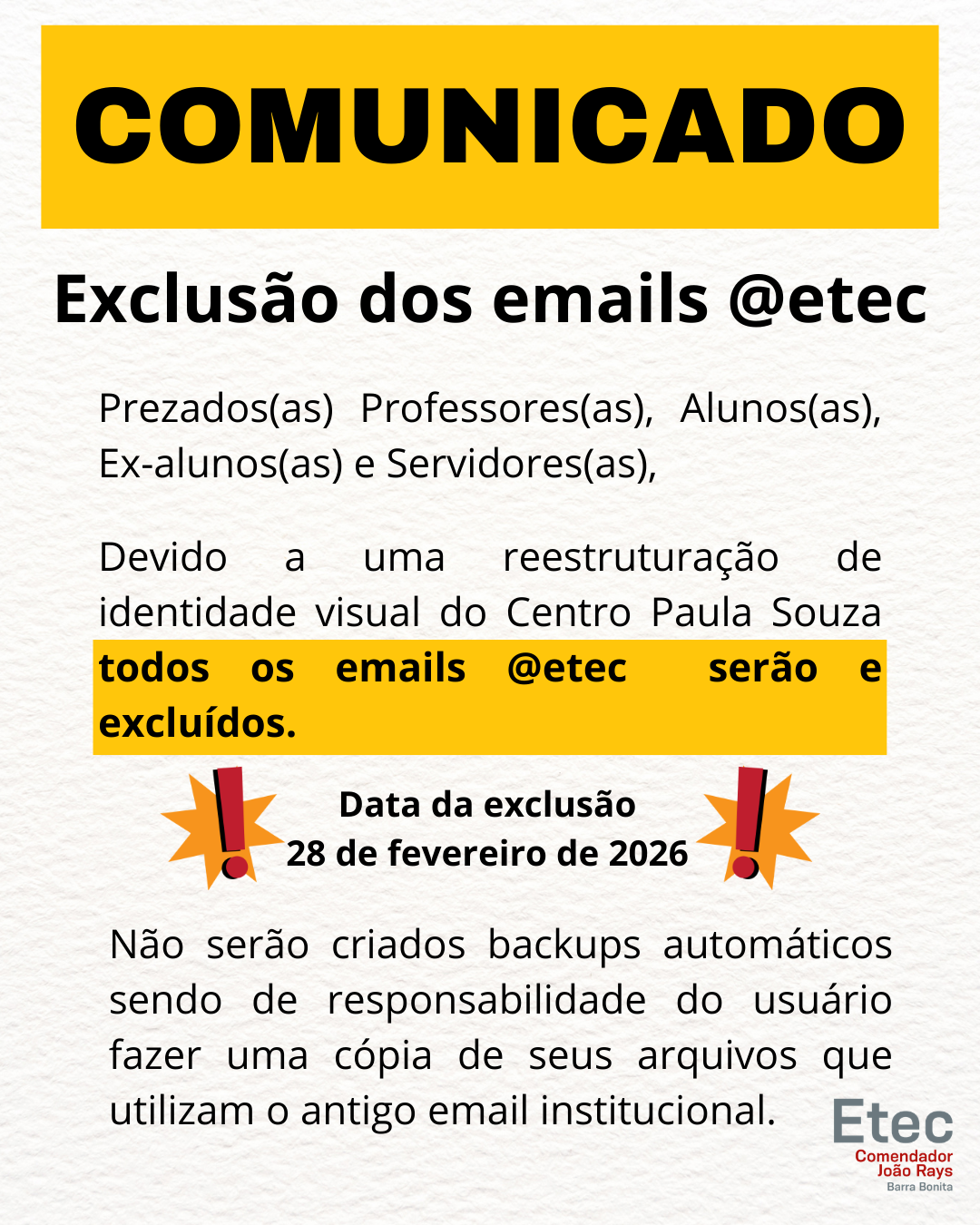 COMUNICADO IMPORTANTE Etec Comendador João Rays Prezados(as) Professores(as), Alunos(as) e Servidores(as), A Superintendência da Etec Comendador João Rays informa que o Centro Paula Souza está promovendo a unificação de sua identidade digital, passando...